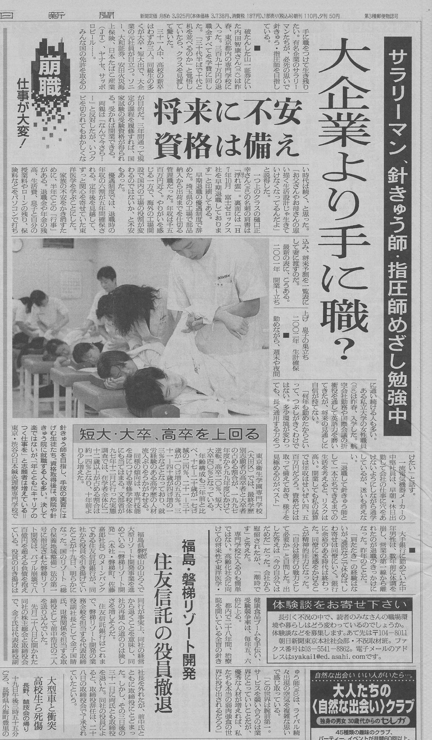 手に職をつけて生き残りたい。有名企業のサラリーマンたちが、必死の思いで針きゅう・指圧師を目指している。